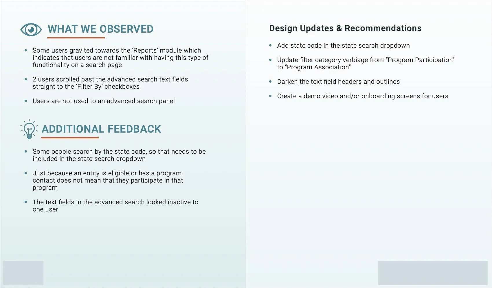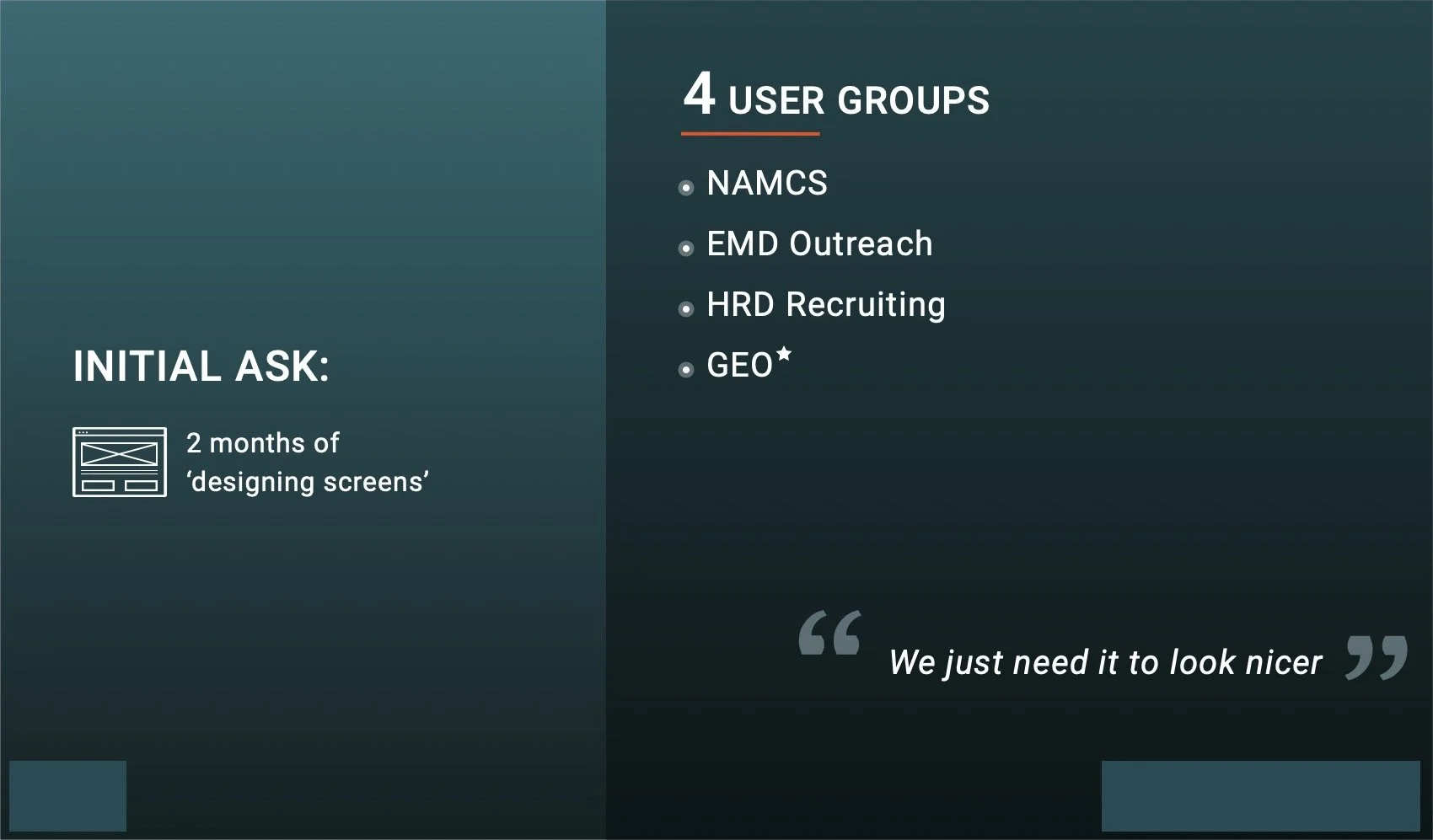 The initial scope of this project was just a two month contract to “visually modernize screens”. I worked to meet their deadlines, but I also conducted rapid research sessions along the way to present recommendations and additional opportunities for improvement. As a result, I gained the clients’ trust, opened their eyes to the human centered design process, and extended the account team’s contract from two months to a full year.